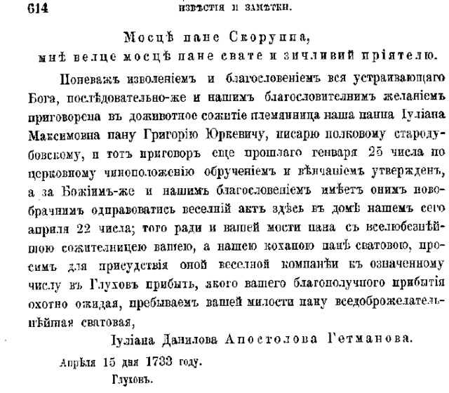 | Письмо жены гетмана Даниила Апостола к Павлу Якимовичу Скоруппе с приглашением его на свадьбу племянницы гетмана Юлианы |